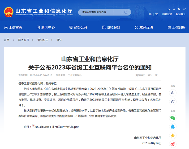近日,山東省工業和信息化廳發布了《2023年省級工業互聯網平臺名單》,山東經典重工集團股份有限公司“經典智慧管理工業互聯網平臺”成功入選山東省級工業互聯網重點平臺名單。