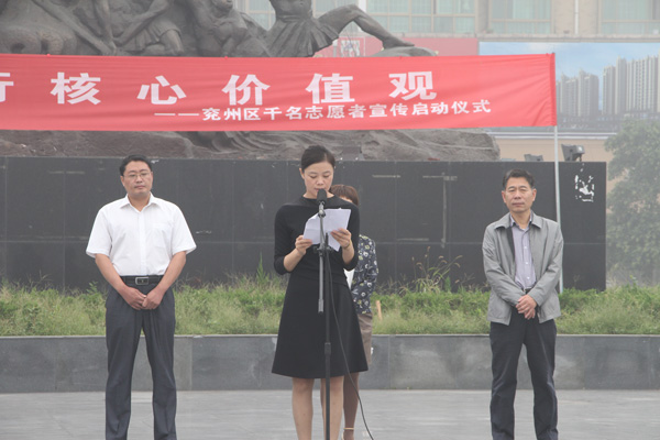 儀式由王仁娜副區長主持。區委宣傳部副部長邢衛紅宣讀了《兗州區弘揚社會正能量踐行核心價值觀倡議書》。集團公司志愿者卞中凱作為全區企業屆代表作了表態發言。儀式上頒發了活動宣傳書籍和資料。初建偉部長作了重要講話。活動最后,廣大志愿者們在活動條幅上鄭重簽下了自己的名字。