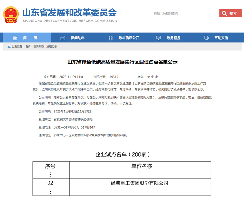 近日,山東省發展和改革委員會公示了山東省綠色低碳高質量發展先行區建設試點名單,經典集團上榜企業試點名單。
