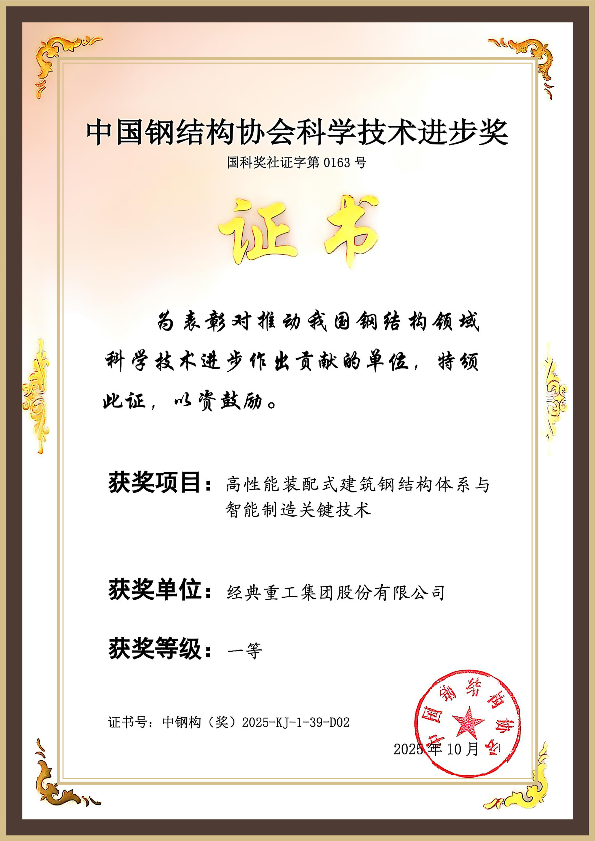 在科學技術獎頒獎典禮上,經典重工集團股份有限公司作為主要科研單位參與的《高性能裝配式建筑鋼結構體系與智能制造關鍵技術》項目榮獲中國鋼結構協會科學技術進步獎一等獎。